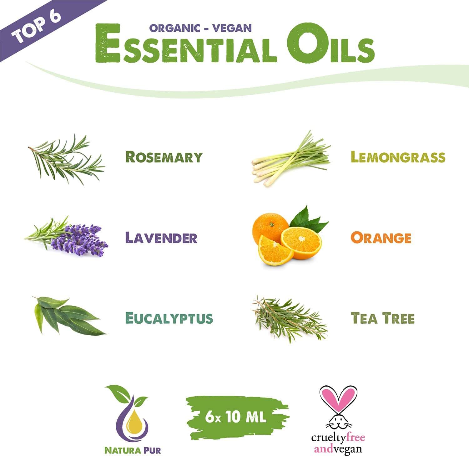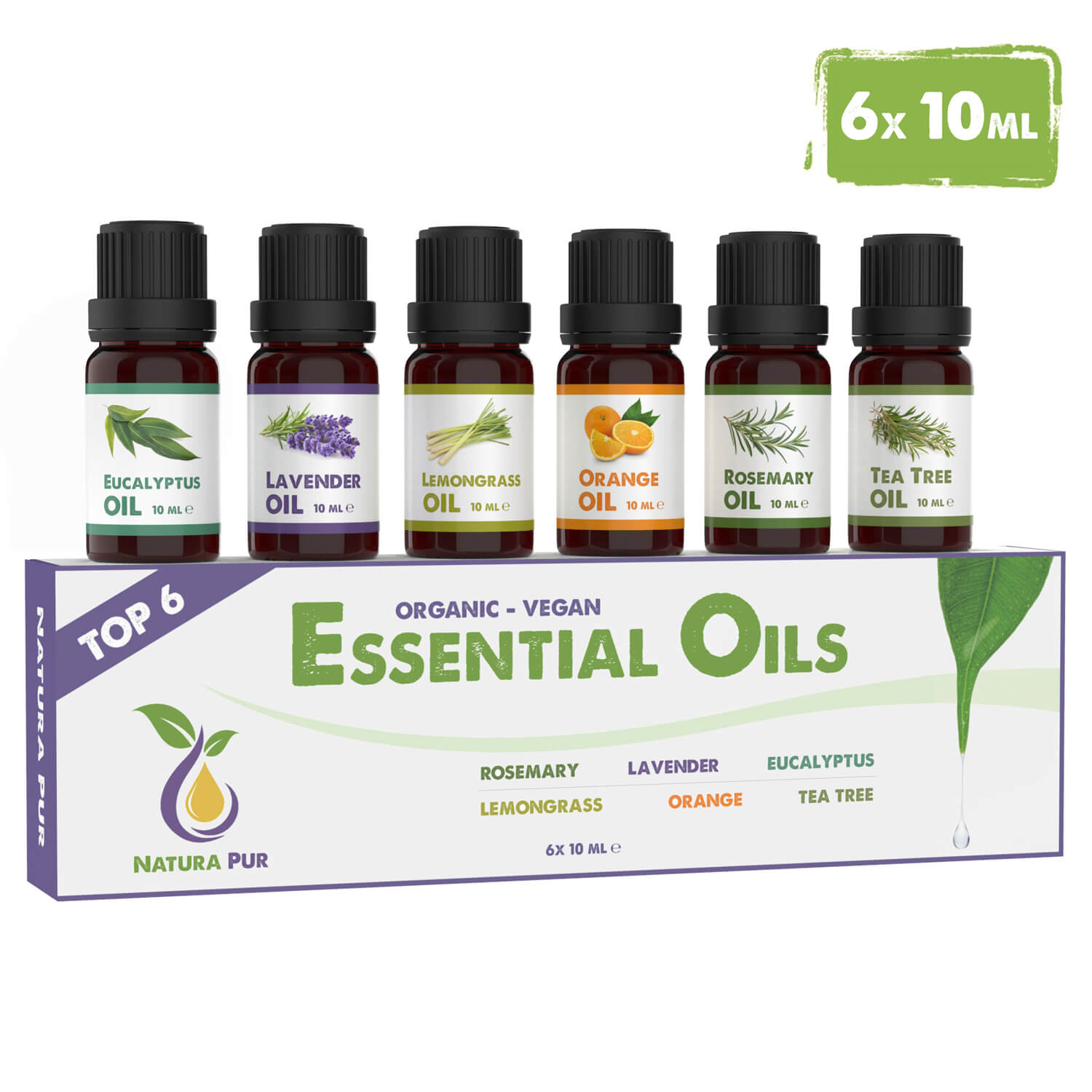 Mit dem praktischen Set, das die bekannten und beliebten ätherischen Öle Rosmarin, Lavendel, Eukalyptus, Zitronengras, Orange und Teebaum in 100% konzentrierter und naturreiner Form zu je 10ml enthält, kannst Du anderen oder Dir eine Freude bereiten.